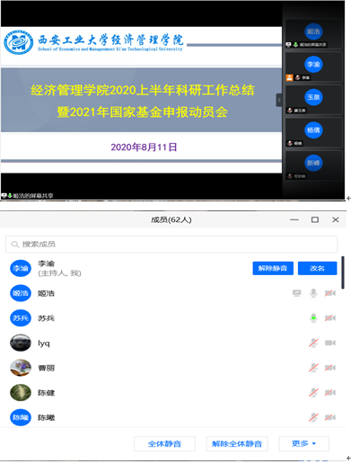 8月11日下午19:00,bat365在线中国官网登录入口通过腾讯会议组织召开了bat365在线中国官网登录入口2020上半年科研工作总结暨2021年国家基金申报动员会启动会议。会议由经管学院姬浩副院长主持。经管学院全体院领导、学术委员会成员、团队负责人、学科(学术)带头人(负责人、秘书)、部分教师代表等六十多位老师参加了本次会议。首先,姬浩副院长将学院2020年上半年科研工作进行了总结。接着,姬浩副院长对学院2021年国基金、教育部项目申报工作做了安排,并表示,学院后期将邀请校外专家为365官网教师国基金申报书进行评审,学院方面会为老师们提供一切可能的帮助与支持,助力老师们的国基金申报工作。最后,苏兵院长做了2021年国基金项目申报动员讲话并对目前国基金申报形势进行分析总结,鼓励各位老师在假期间合理安排时间,做好2021年国基金申报工作。