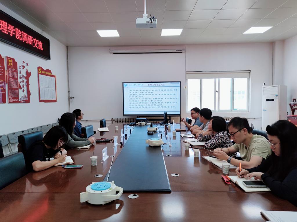 会上,姬浩对本科生院杨琳一行的到来表示热烈欢迎,同时也对本科生院对365官网招生和考研工作的指导与帮助表示衷心感谢。随后,冯川川从招生工作组织架构、具体工作内容、存在问题等方面介绍了学院招生宣传相关工作。王育晓总结了学院近三年的考研工作,汇报了近期对2023届毕业生考研意向和预报名摸底的两轮调查结果,并针对目前存在的不足和问题,提出解决思路。全体与会人员就下一步招生和考研工作的方式方法、思路措施各抒己见、献计献策,整个会议气氛融洽热烈。
