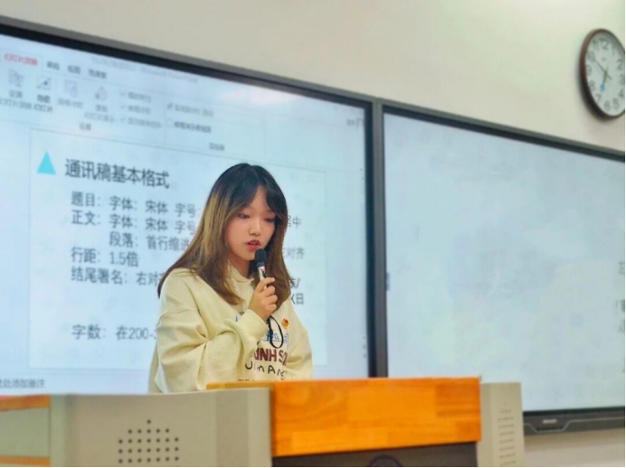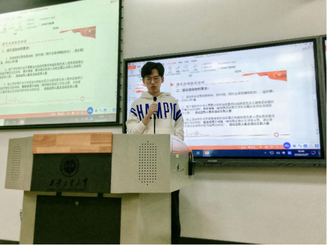 大会伊始,19050719团支部魏嘉博发言。魏嘉博表示,作为一名团干部,要具备创新、管理、宣传发动和组织领导能力,同时也将通过本次培训来提高自己的思想境界、工作能力及综合素质。紧接着,组织部温迪从职能介绍、团日活动开展要求及活动材料收缴要求三方面给各支部干部进行培训。其次,记者团徐一诺进行通讯稿的写作培训,分别阐述了通讯稿的格式、内容、照片及存放方式等相关要求。随后,青年志愿者协会夏维婷对第二课堂工作进行分析说明并答疑有关问题,使在座的各团干部更加清晰地了解工作内容及流程。最后,团委副书记卢红升号召各支部团干部积极发挥各自职能,响应相关政策变化,共同为365官网学生工作付诸努力,创造更美好的明天。