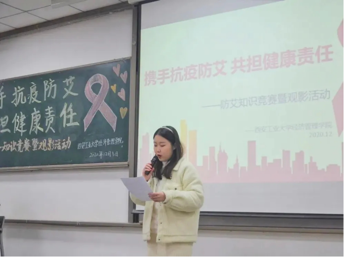 活动伊始,主持人介绍了艾滋病的相关知识,并通过播放宣传片《生无畏》使同学们进一步的了解世界艾滋病日的意义。紧接着,防艾知识竞赛正式开始,参赛人员以小组为单位限时十分钟答题,并设立奖项一、二、三等奖共六组。随后,大家共同观看有关艾滋病的影片《达拉斯买家俱乐部》。最后,团委副书记卢红升为获奖小组颁奖。