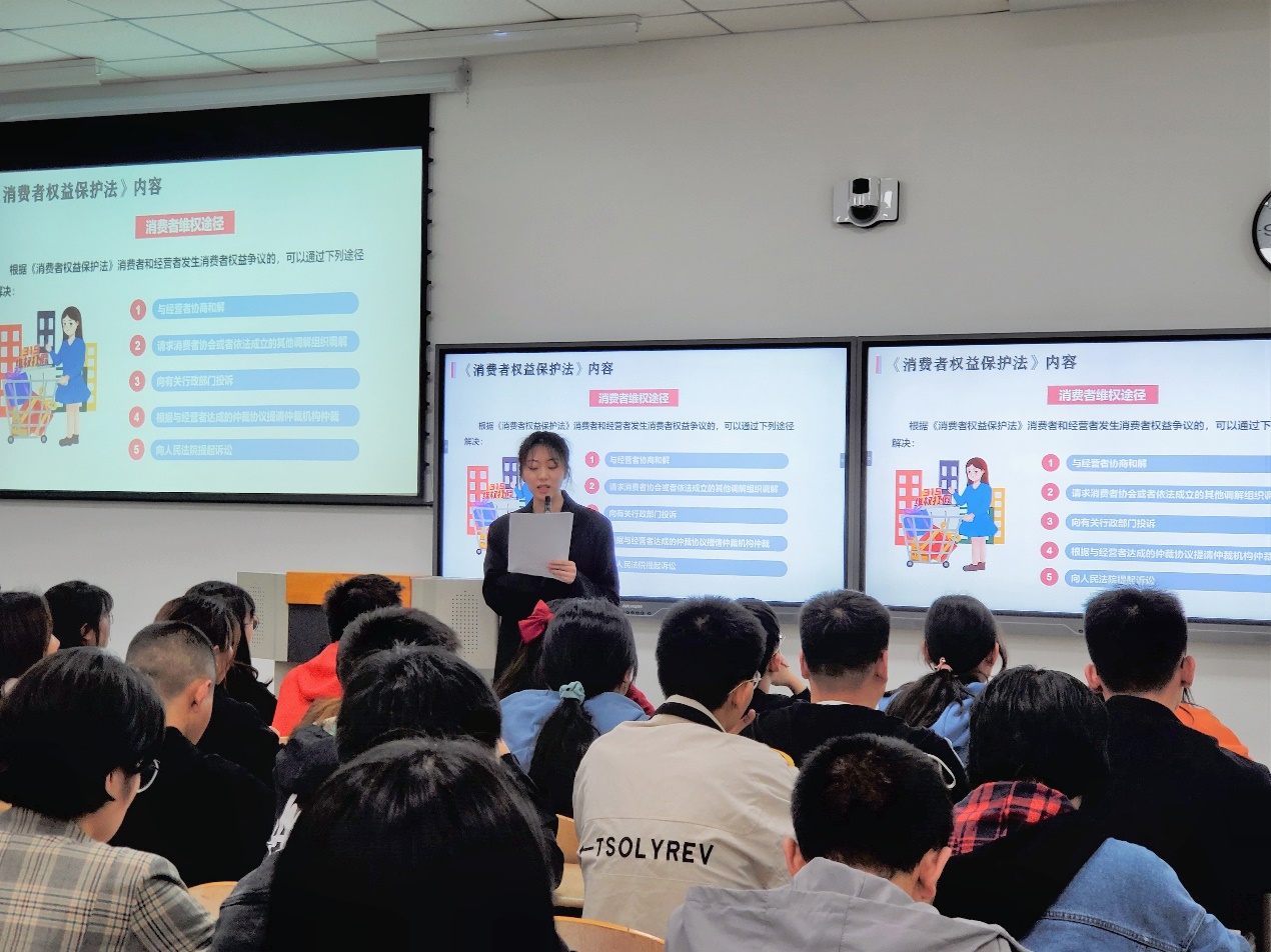 活动伊始,尹若冰先向大家介绍了有关国际消费者权益日的相关知识,国际消费者权益日设立于每年的3月15日,为的是在国际范围内保护消费者的合法权益。接下来,尹若冰从消费者拥有的权利、经营者的义务以及消费者的维权途径三个部分,向大家介绍了消费者权益保护法的相关内容,《消费者权益保护法》保护了我们的合法权益,同时促进了社会经济的健康发展。